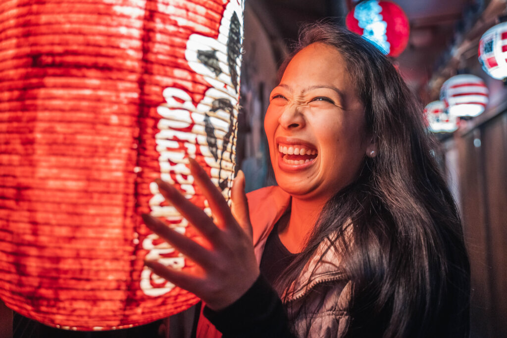 One of the most atmospheric locations in Dotonbori is a narrow alley lined with glowing red lanterns.